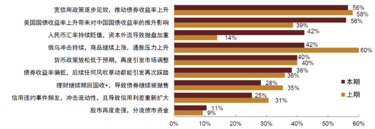 资料来源:调查问卷,中金公司研究部(本期问卷于北京时间2022年4月23日下午面向银行、保险、基金、券商、信托等从事固定收益领域的人士,共收集170份问卷;上期调查时间为2022年3月11日,下同)