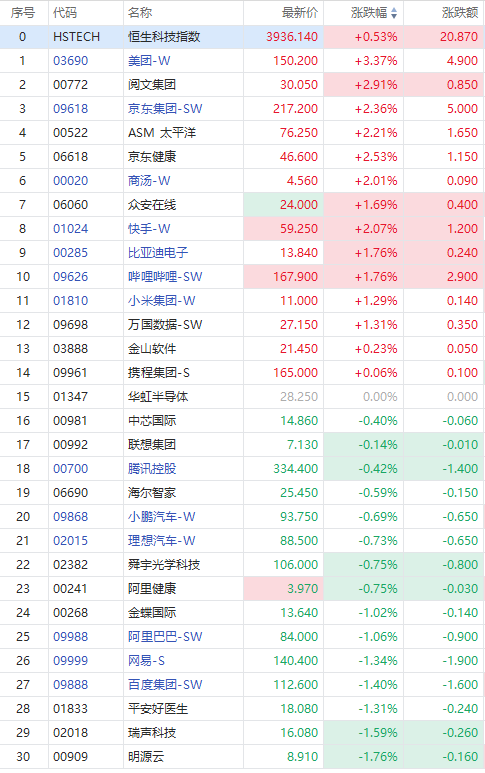 成分股中,美团涨3.37%领涨,阅文集团、快手和京东集团涨超2%;明星科网股涨跌互现,比亚迪电子、小米、哔哩哔哩涨超1%;腾讯微跌0.42%,汽车股中,小鹏、理想跌约0.7%,阿里巴巴、网易、百度跌超1%。