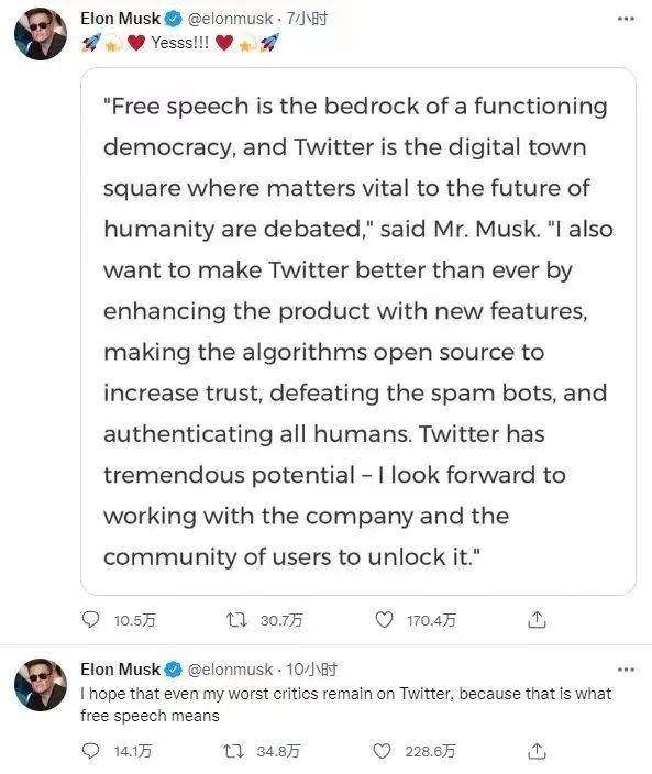 第二件,是向全世界宣告了“新推特时代”的无限畅想,以及昨日刷爆网络的“言论自由是民主运作的基石”。