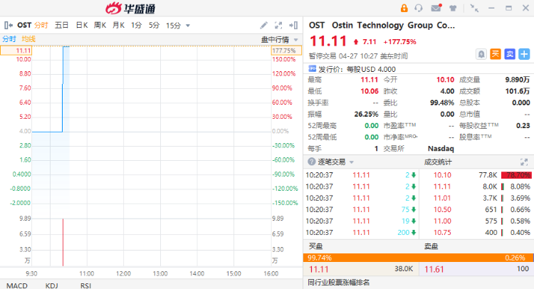 华盛资讯4月27日消息,中国显示模组和偏光片供应商奥斯汀科技集团正式登陆纳斯达克,截至发稿,该股涨超177%触发熔断,现报11.11美元。