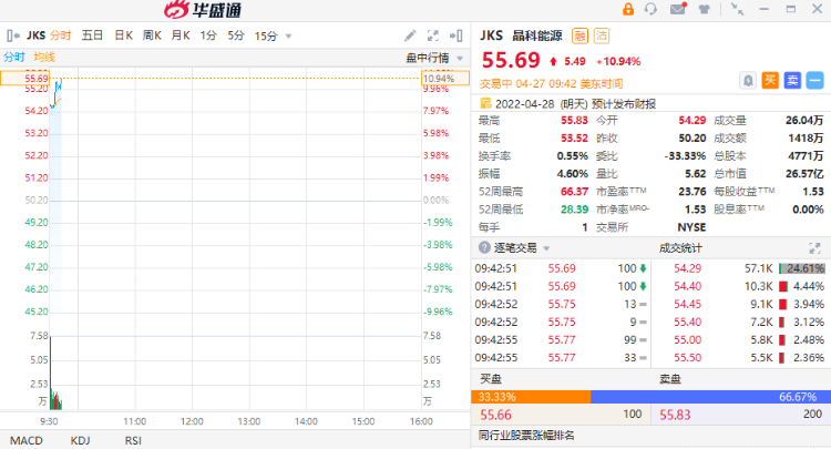 华盛资讯4月27日消息,美股盘初,清洁能源股集体上涨,晶科能源(JKS)涨近11%,报55.69美元。