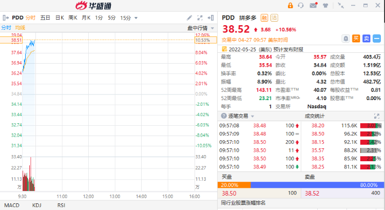 华盛资讯4月27日消息,热门中概股多数反弹。截至发稿,拼多多(PDD)涨超10%,现报38.52美元。