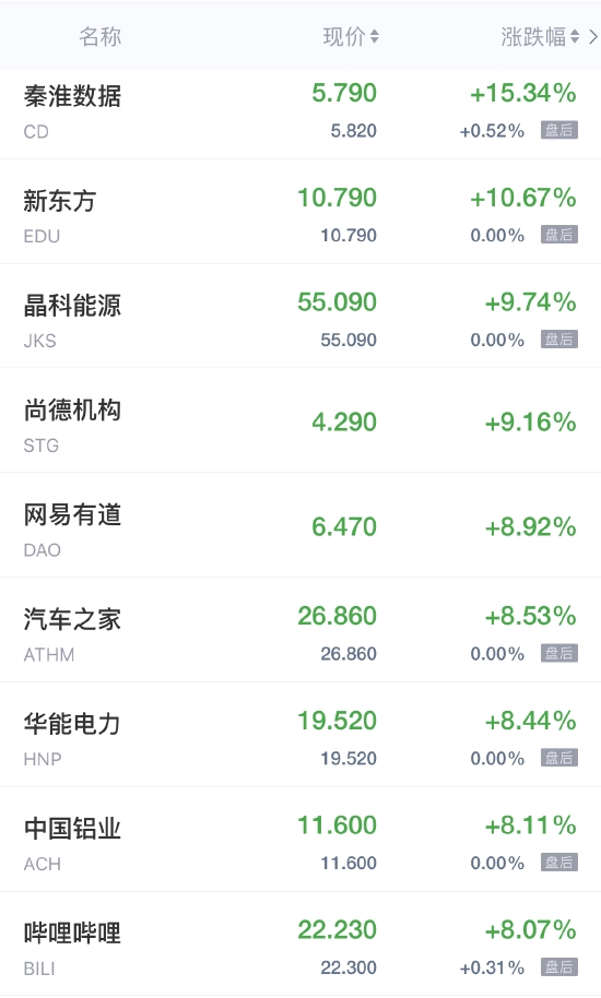 领涨中概股列表: