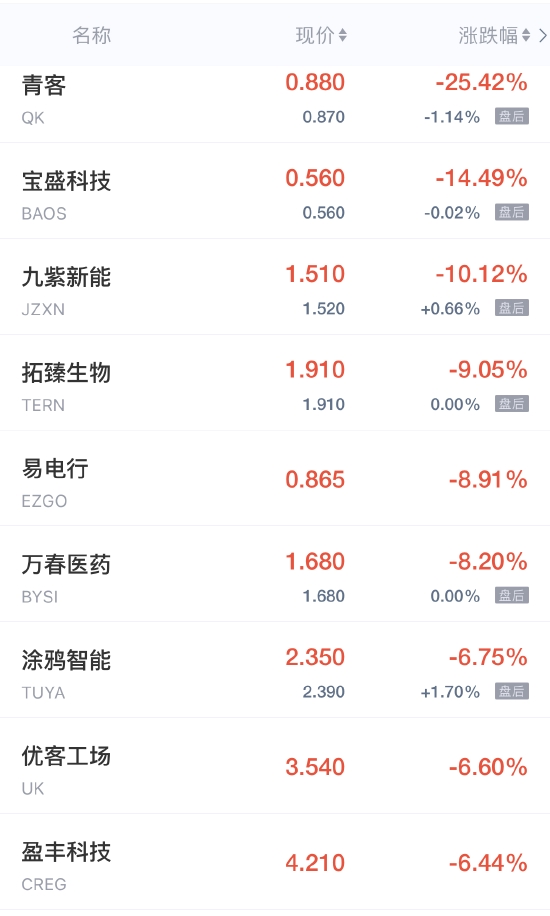 青客跌超25%,九紫新能跌超10%,涂鸦智能跌超6%,趣头条跌超5%,猎豹移动、途牛、中网载线、红黄蓝跌超4%,每日优鲜、法拉第未来跌超3%,凤凰新媒体跌近3%,达达集团、怪兽充电、51Talk、小牛电动跌超2%,百世集团跌2%,叮咚买菜跌超1%,腾讯音乐跌近1%。