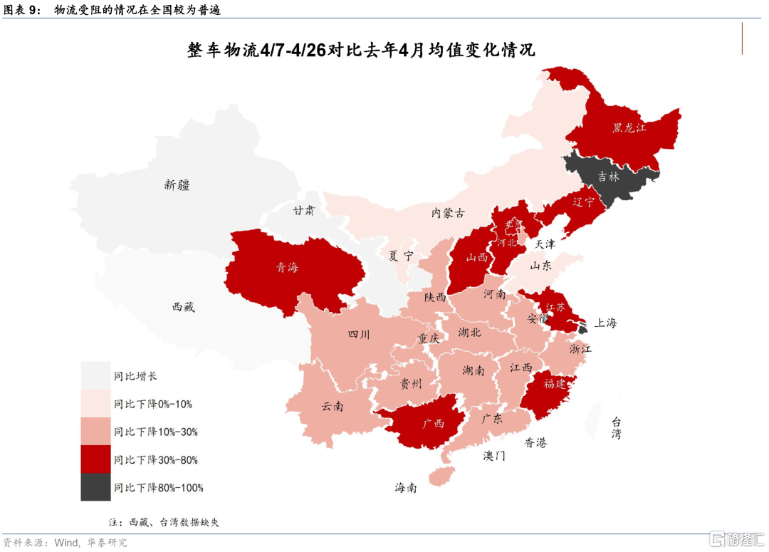 2) 分区域的影响:物流受阻的情况在全国较为普遍,并不局限于上海、吉林等疫情较为严重的地区。实际上,除新疆外,全国所有省份今年4月中旬的整车货运物流指数无论是相比2021年4月、还是相比今年3月均有所下降(西藏和台湾数据缺失)。以同比降幅衡量,上海和吉林降幅约80%,而超过30%的省/直辖市已达11个、占2021年GDP的36%。