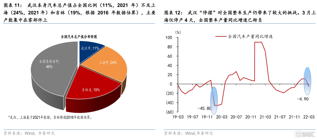 2) 物流受阻和开工率下降可能互相形成制约。尤其是,汽车、电子产业链供应链长,分工细,且定制化程度高,一地停产很可能造成全产业链的大面积交付延迟、甚至停产;而本次受疫情影响最大的上海和吉林均在汽车和电子产业链上占有举足轻重的地位。货运受阻不仅直接减少员工和产品的“流动”,也间接延长了生产周期、加大生产成本。与2020年首轮疫情之后快速、大力组织复工复产不同,本轮疫情在全国错落爆发导致供应链上各企业开工参差不齐。在环环相扣的供应链中,原材料采购-生产-出货等任一环节受阻,都可能意味着整条产业链的拥堵。值得注意的是,本次受疫情影响最大的上海和吉林均在汽车和电子产业链上占有举足轻重的地位(2021 年上海和吉林汽车产量合计 125 万辆,占全国汽车产量19%。此外,汽车零部件企业如采埃孚、电装 等也大多位于上海)。而众所周知的是,汽车、电子产业链供应链长,分工细,且定制化程度高,一地停产很可能造成全产业链的大面积交付延迟、甚至停产。2020 年初武汉疫情期间,虽然武汉本身汽车总产值占全国比例(11%,2021 年)不及上海(24%,2021年)和吉林(19%,根据 2016 年数据估算,图表11),主要产能集中在零部件上,但是,武汉“停摆”对全国整车生产仍带来了较大的挑战——2020年 1 季度,全国整车产量下降 46%。3 月上海仅停产 4 天,全国整车产量已经同比由升转跌、收缩 4.9%(图表12),而随着库存零部件用尽,4-5 月停产面积可能会指数型上升。其他产业链较长、分工较细的行业也可能遭受同样的困境。截至4 月中旬,上海及吉林等地的新能源汽车、半导体等科技行业企业普遍反映零部件断供情况已经较为普遍。