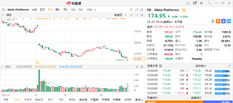 - 周三(4月27日),受财报利好,Meta盘后飙升超18%,市值再度回升至5000亿美元上方。而在财报公布之前,因Meta此前Q4财报不利及上周奈飞财报再度爆雷,市场普遍猜测本次Meta会不会再度遭遇“财报杀”。不过Meta此次Q1财报显示,日活用户高于预期,且当季盈利和元宇宙收入超出市场预期。