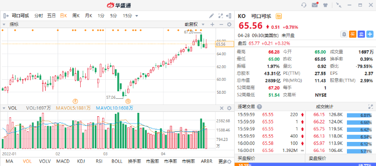 - 本周一,巴菲特爱股可口可乐盘中触及历史最高价67.2美元,截至本周三收盘,年内累计涨幅已达11.55%,大幅跑赢美股大盘指数。周一美股盘前,可口可乐发布了Q1财报,数据显示可口可乐业绩十分强劲。
