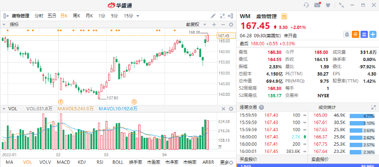 3、美国废物管理公司 $WM Q1营收、每股盈余均超预期,本周股价逆市走高,瑞银上调其目标价至185美元