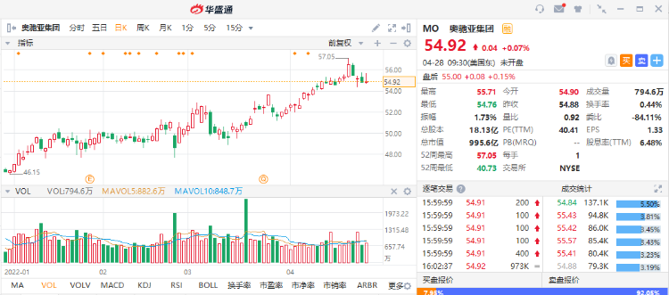 4、奥驰亚 $MO 近期股价持续上行表现强势,兼有自由现金流强、高股息等特点,获高盛推荐