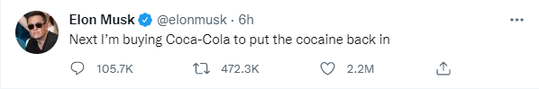- 而刚刚高调宣布收购推特的马斯克,当地时间本周三,在推特发文称,接下来的目标是要买可口可乐,并称要“再把可卡因重新加进去”。虽然看起来马斯克像是在“口嗨”,但马斯克曾在2017年也“开玩笑”说要收购推特,最终在2022年4月发出收购要约。