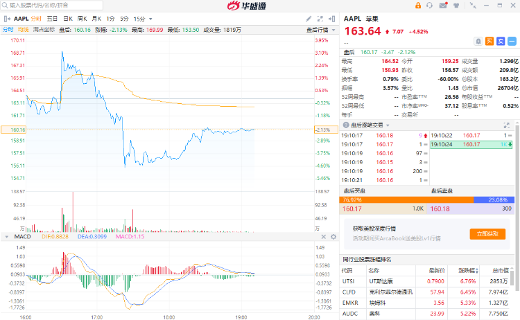 当日,苹果公司股价在纳斯达克常规交易中上涨 7.07 美元,报收于 163.64 美元,涨幅为 4.52%。