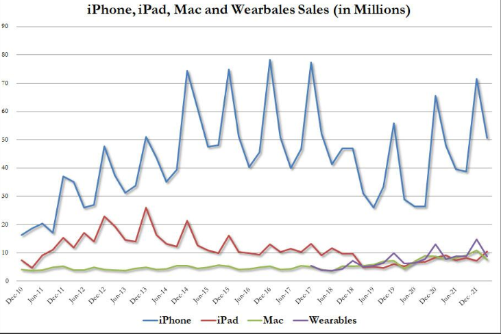 来自于 iPad 的营收为 76.46 亿美元,相比之下去年同期为 78.07 亿美元;