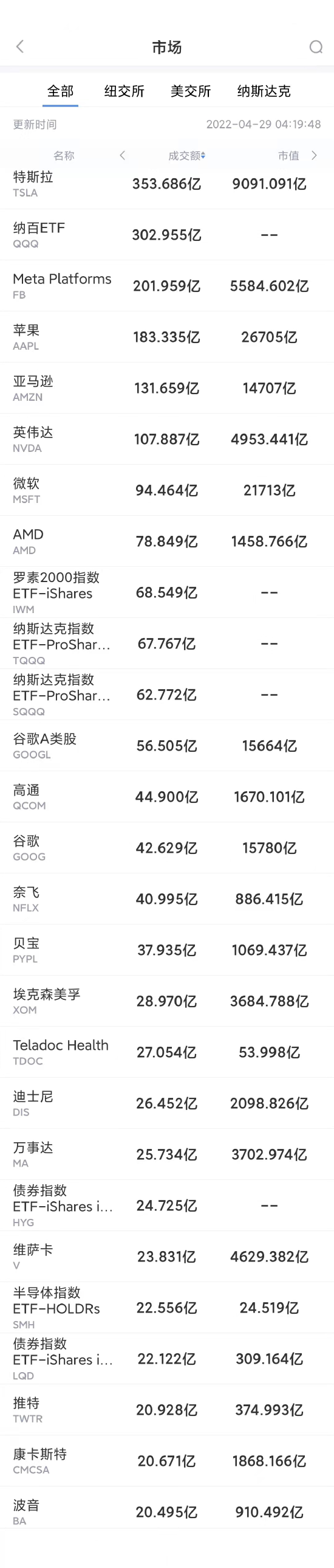 第2名Facebook的母公司Meta Platforms收高17.6%,成交202亿美元。该公司周三收盘后宣布第一财季净利润74.65亿美元超预期,日活跃用户数量(DAU)同比增长4%至19.6亿。绩后摩根士丹利将其目标价从325美元上调至330美元。