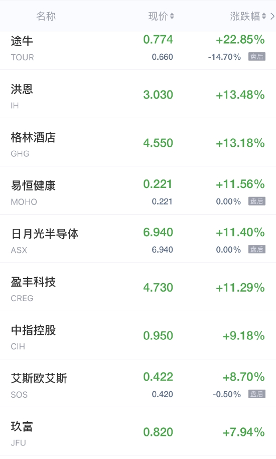 领涨中概股列表:
