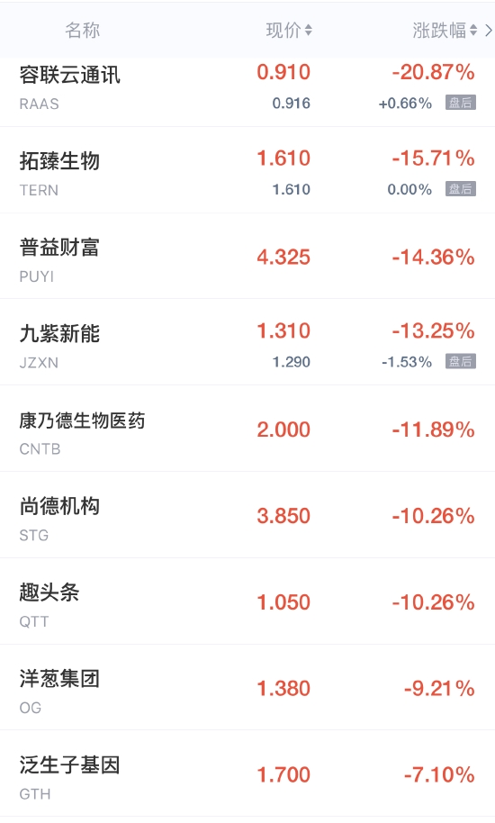 九紫新能跌超13%,趣头条跌超10%,洋葱集团跌超9%,每日优鲜、微美全息跌超6%,凤凰新媒体跌超4%,优信跌近4%,晶科能源跌超3%,新氧跌近3%,中网载线跌超2%,叮咚买菜跌超1%。