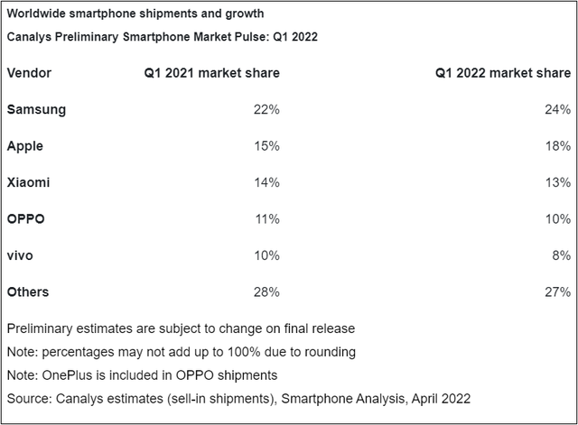 据市调机构Canalys发布的数据,2022年第一季度全球智能手机出货量下降了11%。其中,三星以24%的市场份额位列第一,苹果市场份额为18%,小米以13%紧随其后,OPPO和vivo排在第四和第五,分别为10%和8%。