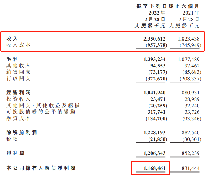 中报显示,中教控股在截至2022年2月28日的六个月收入达到23.5亿元人民币(单位下同),同比增长近30%。归属公司拥有人的应占净利润达到11.68亿元,同比增长约40%。