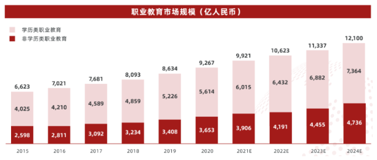 2020年,我国职业教育市场规模突破了9000亿元。据弗若斯特沙利文的预测,到2024年,我国职业教育市场规模有望达到1.2万亿人民币。学历类和非学历类职业教育都将稳定增长,其中非学历类职教发展可能更为迅速,因职业技能培训受产业结构升级和劳动力市场人才素质提升需求影响也更大。