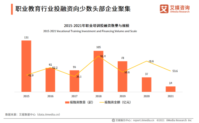 从产业链来看,上中下游细分赛道众多,且各赛道集中第较低,竞争激烈。但是新冠疫情进一步加速了行业洗牌,经过整合后的职业教育市场融资正向少数头部企业聚集。2021年职业培训投融资数量下降至14起,创出近几年的新低。这意味着已经具备融资、盈利能力的头部企业,将进一步抢占市场份额,扩大经营规模。
