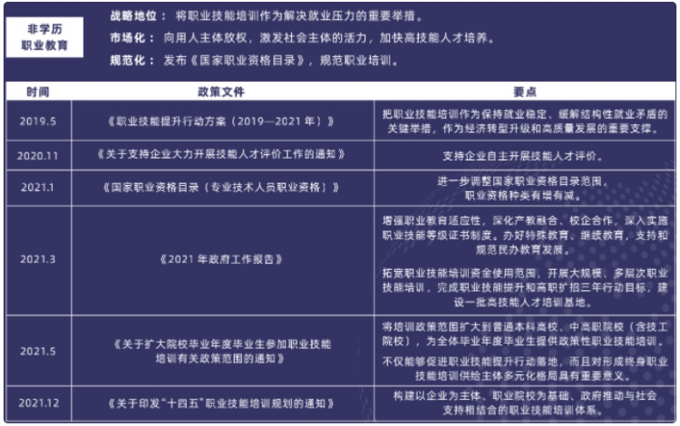 在政策推动下,此前较为混乱的非学历职业教育逐步走向市场化和规范化,短期内有助于解决就业压力,长期来看则对建设终身教育体系有重要意义。
