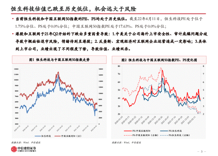 当前恒生科技和中国互联网50指数的PE、PS均处于历史低位。截至22年4月11日,恒生科技PE处于位于1.75%分位、PS处于0.0%分位;中国互联网50指数PE处于17.63%、PS处于0.0%分位;