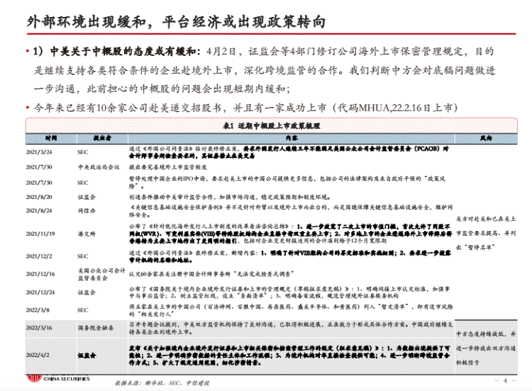 1)中美关于中概股的态度或有缓和。4月2日,证监会等4部门修订公司海外上市保密管理规定,目的是继续支持各类符合条件的企业赴境外上市,深化跨境监管的合作。我们判断中方会对底稿问题做进一步沟通,此前担心的中概股的问题会出现短期内缓和;此外,今年来已经有10余家公司赴美递交招股书,并且有一家成功上市(代码MHUA)