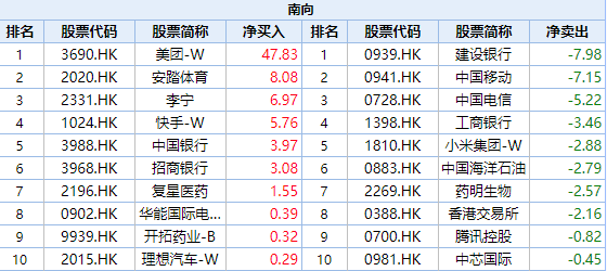 个股资金流向统计:南下资金加仓美团-W、安踏体育;抛售建设银行、中国移动