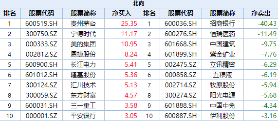 本周北上资金买入金额最多的标的为贵州茅台,一周净买入25.35亿元,宁德时代获净买入11.17亿元,美的集团获净买入10.95亿元;此外,恩捷股份、长江电力等获得买入。
