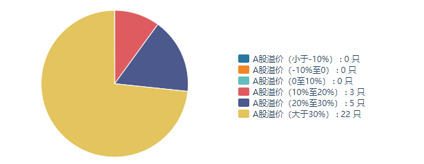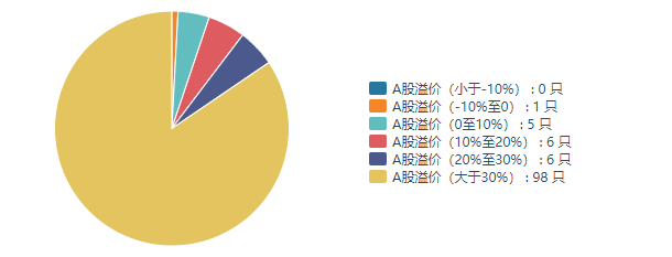 本周有120只A股溢价超过30%,11只溢价在20%至30%之间,9只在溢价10%至20%之间,5只溢价在0-10%之间,1只溢价在-10%-0之间。