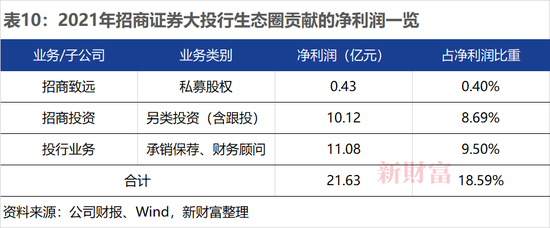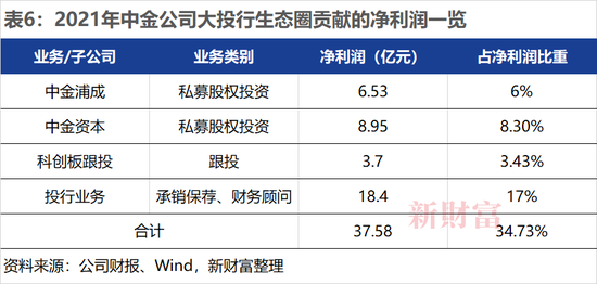 如果用2021年底科创板跟投浮盈,减去2020年底科创板跟投浮盈,并扣除30%费用率和25%税率,计算2021年券商的跟投利润,可以得出,中金公司约为3.7亿元。再以2021年投行业务营业利润的75%来估算其净利润,得到的数据约为18.4亿元。加上私募股权业务方面,中金资本8.95亿元净利润及中金浦成6.53亿元净利润,中金公司2021年 “投行+私募股权子公司+跟投业务”构成的大投行生态圈贡献的净利润总额达到37.58亿元,占其同期全部净利润的比重高达34.73%(表6)。
