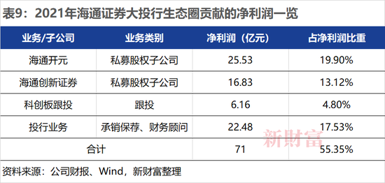 海通证券由于私募股权业务表现较为突出,大大拉高了大投行生态圈的净利润贡献占比,达到55.35%,为头部券商中占比最高的一家(表9)。