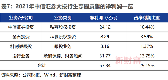 根据2021年中信证券财报估算,其传统投行业务净利润约为31.77亿元,作为行业里当之无愧的龙头,其传统投行业务占同期公司净利润总额仅为13.75%。但若加上私募股权和跟投净利润,其大投行业务净利润占比大幅提升至29%(表7)。