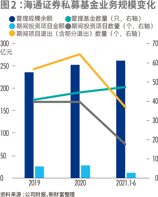 仅2020年上半年,海通证券私募股权投资业务新增募集资金29亿元,完成投资项目40个,新增上市过会项目20个(其中科创板10个),实现退出收益22.9亿元。截至2021年6月末,其该业务管理规模为264亿元,2021年上半年完成投资项目18个,投资金额10.8亿元,新增上市(含过会)项目10个,在会项目15个(图2)。