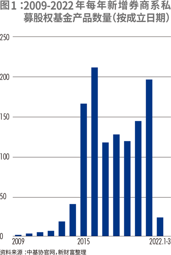 在此之前,券商已开始调整直投业务,纷纷设立全资的私募子公司。2016年度,新成立的券商私募股权基金产品猛增211只,创历史新高,此后也是保持高位,2021年为196只(图1)。