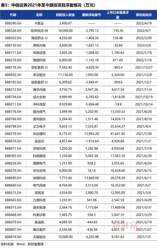 即便是头部券商,最新跟投项目中出现浮亏的现象也越来越普遍。中信证券子公司中信证券投资,2021年以来共跟投了29个科创板项目,截至2022年4月28日,有13个项目浮亏,其中,经纬恒润-W、莱特光电、亚虹医药、迪哲医药、成大生物、中科微至等均在上市首日破发,之后股价一路下探,导致中信证券跟投浮亏加大(表5)。