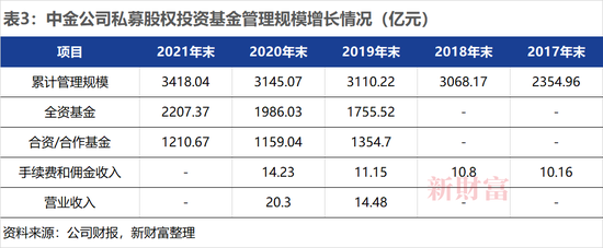 中金公司的私募股权管理规模处于行业前列,早在2018年就突破3000亿元,手续费和佣金收入突破10亿元,到2020年末,后一数据增加至14亿元(表3)。截至2021年底,中金公司的私募股权管理规模达到3418.04亿元。