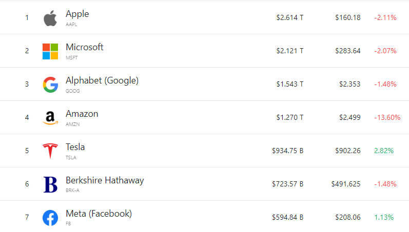 多数大型科技股也走低,(按市值排列)苹果跌2.11%,微软跌2.07%,谷歌跌1.48%,仅Meta涨1.13%。