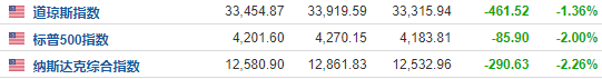 截止发稿,纳斯达克指数跌2.26%,先前一度跌超2.5%;标普500指数跌2%,道琼斯指数跌1.36%。