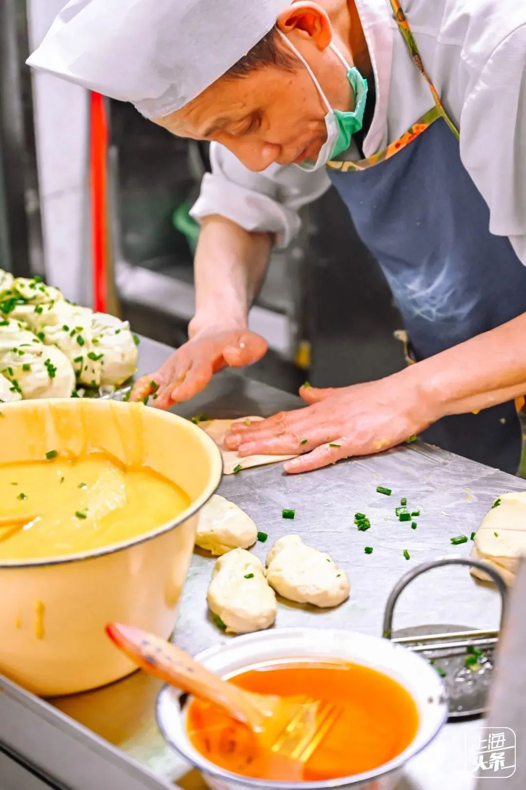 不管是永嘉路的阿大葱油饼、虹口提篮桥的老摊葱油饼或是弄堂口的任一家小店,葱油饼都是阿拉不能舍弃的美味,面皮裹挟着葱花,在炉子上滋滋作响,一口入魂!