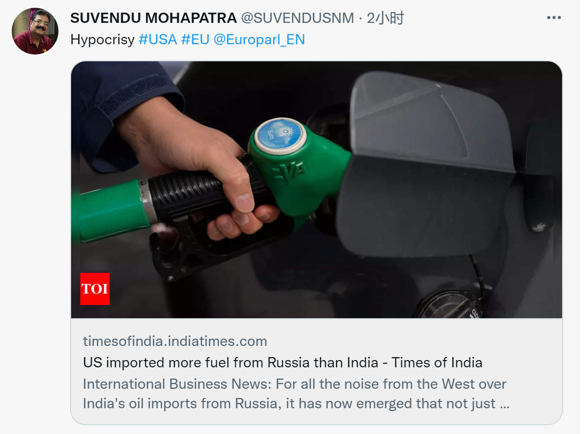 【环球网报道】“美国从俄罗斯进口的燃料比印度还多,”《印度时报》30日以此为题的文章称,尽管西方对印度从俄罗斯进口石油发出种种噪音,但现在有报告已经表明,自俄罗斯与乌克兰开战以来,不仅是欧洲国家,甚至连美国从俄罗斯进口的化石燃料量都超过了印度。