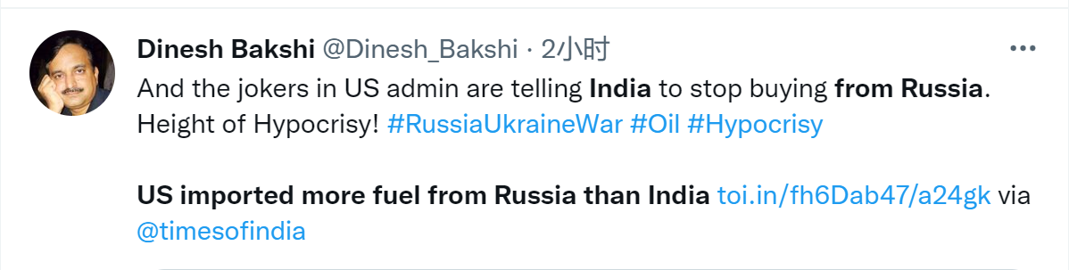 “美国政府里的小丑告诉印度停止从俄罗斯购买(能源)。高度虚伪!”