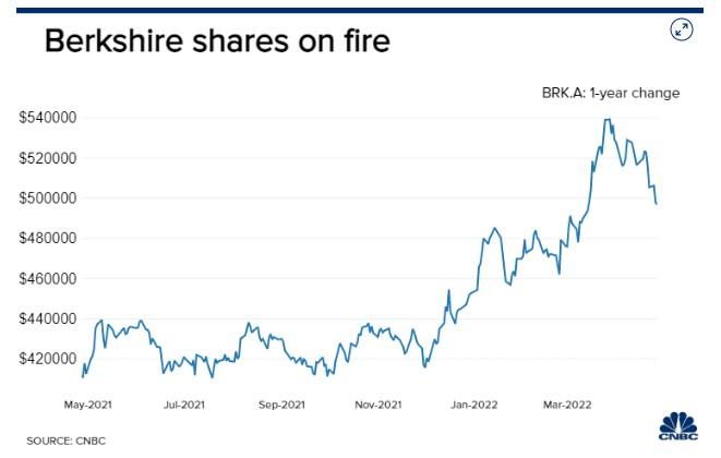 伯克希尔的股价在动荡的市场中一路飙升,伯克希尔的股价更是在上月首次突破50万美元。据悉,该股今年迄今上涨10%以上,而标普500指数则下跌了10%。