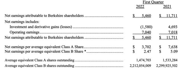 一季度,伯克希尔每股A类普通股盈利3702美元,B类普通股每股盈利2.47美元。相比之下,去年同期每股A类普通股盈利7638美元,B类普通股每股盈利5.09美元。