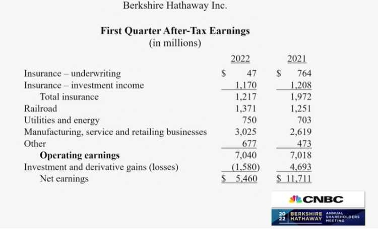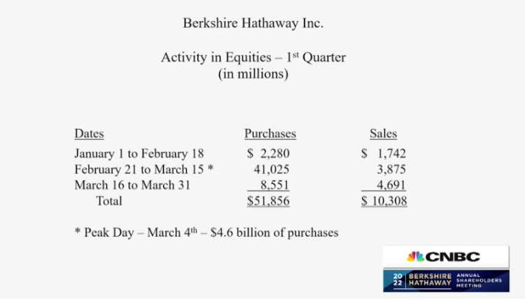 巴菲特同时列举了一季度股票交易情况。伯克希尔在第一季度的市场动荡期间购买了价值超过510亿美元股票,其中包括针对雪佛龙、惠普和西方石油公司等的大笔买单。而与之相比,伯克希尔在2021年一季度净卖出74亿美元股票。