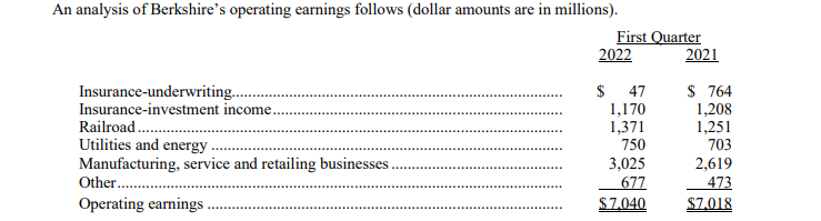 财报显示,伯克希尔的保险承保业务营业利润大幅下降,而其他业务(铁路业务;公用事业和能源业务;制造业、服务业和零售业)营业利润稳步增长。