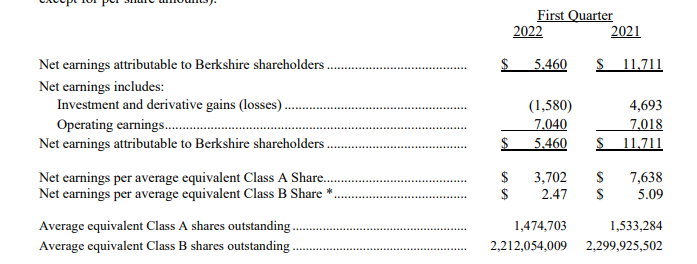 一季度,伯克希尔每股A类普通股盈利3702美元,B类普通股每股盈利2.47美元。相比之下,去年同期每股A类普通股盈利7638美元,B类普通股每股盈利5.09美元。
