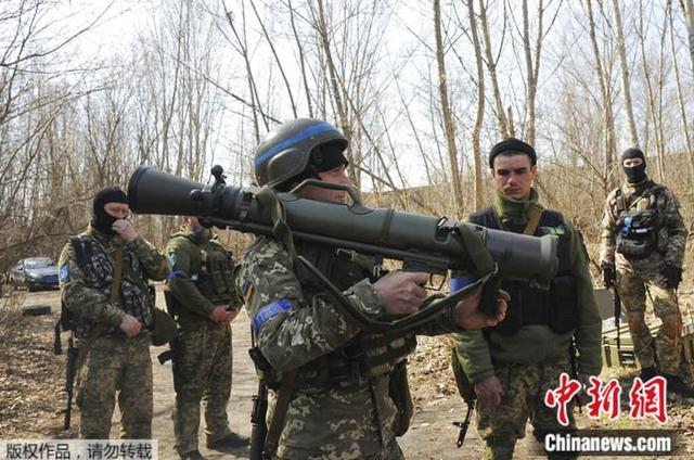 2022年4月7日,乌克兰哈尔科夫附近,乌克兰军人在学习使用瑞典肩扛式武器。