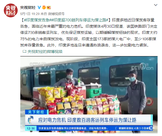 【#印度煤炭告急##印度超700趟列车停运为煤让路#】印度多地近日煤炭库存量告急,面临近年来最严重的电力危机。印度媒体4月30日报道,该国铁路部门决定停运700多趟客运列车,优先保证煤炭运输,以期缓解煤炭短缺的现状。印度大约75%的电力来自煤炭发电,现阶段,印度全国173家燃煤火电厂中,至少108家煤炭库存量告急。此外,印度多地连日来遭遇热浪袭击,进一步加剧电力紧张。