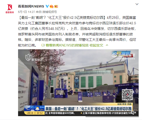 【最后一刻“截胡”?“化工大王”报价42.5亿英镑竞标切尔西】4月29日,英国首富英力士化工集团董事长拉特克利夫突然宣布参与竞标切尔西足球俱乐部出价42.5亿英镑(约合人民币348.5亿元)。上月,因俄乌冲突爆发,切尔西俱乐部老板,俄罗斯寡头阿布被英国政府列入制裁名单,并被英超取消担任俱乐部董事的资格。随后,多家财团参与竞标。据报道,尽管化工大王最后一刻拿出高价,但可能为时已晚。